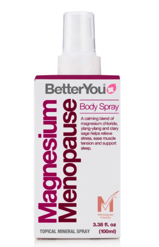 BetterYou Magnesium Menopause Body Spray provides a calming blend of magnesium chloride, ylang-ylang and clary sage helps to relieve stress, ease muscle tension and support sleep.